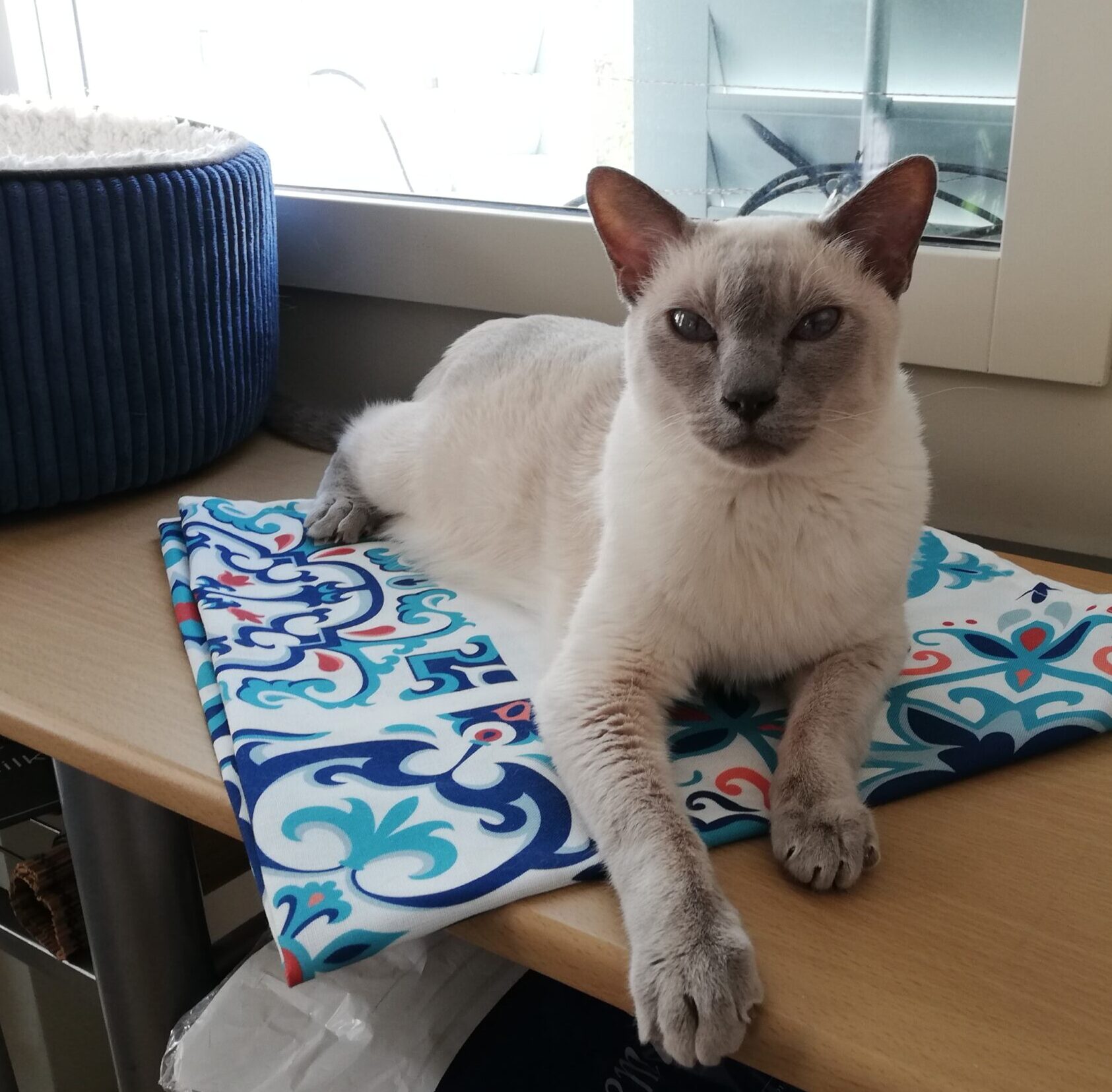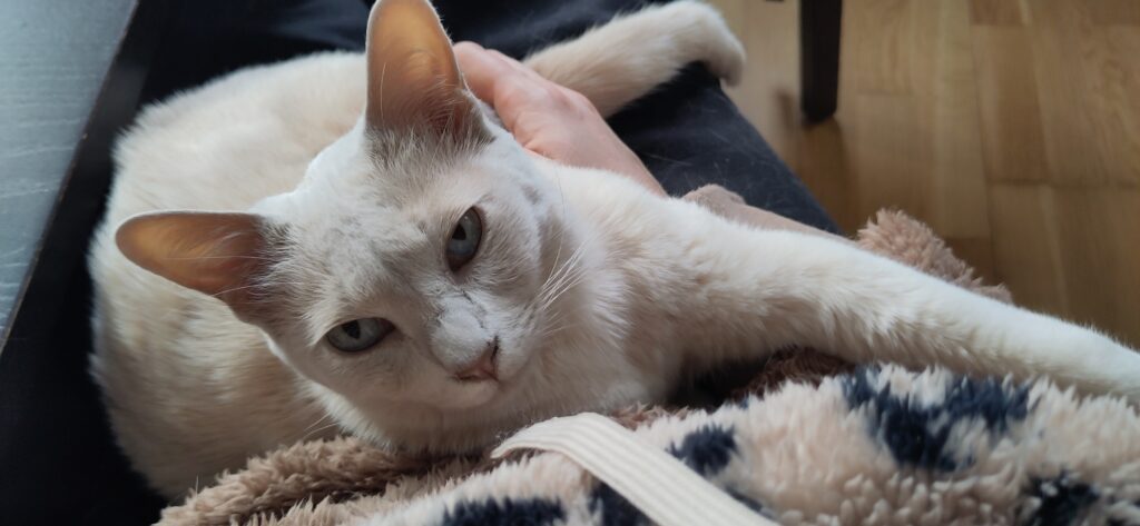 Unsere Kätzin Gisi ist seit Ende 2023 bei uns, sie ist eine zahnlose, cremefarbige Tonkanesin.