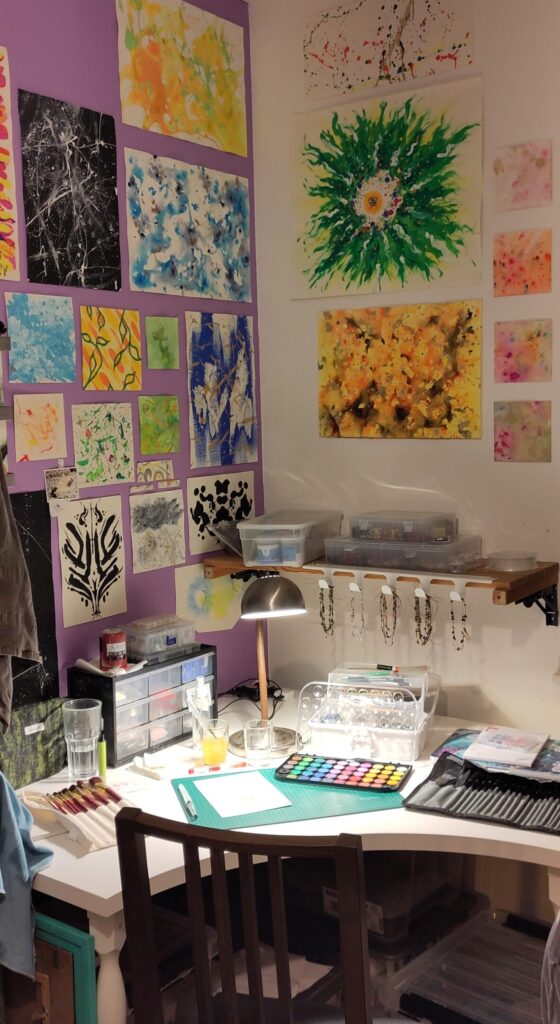 Hier sehen Sie, wo die Magie stattfindet – in meiner eigenen kleinen Kreativecke, umgeben von den selbstgemalten Klinik-Bildern der Burn-Out Zeit, welche mir Kraft und Ruhe geben und mich gleichzeitig in meinen positiven Flow bringen. ♥